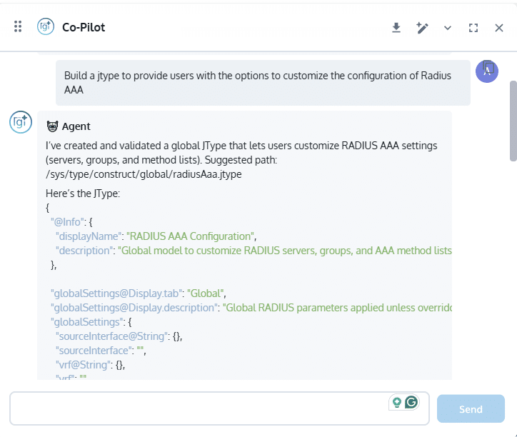 The Gluware Co-Pilot, powered by Gluware Titan with agenic AI and the Gluware Intelligent MCP Server, assists developers throughout the automation lifecycle. It suggests data models, code snippets, and integrations; helps resolve syntax issues; and accelerates development by providing smart, context-aware guidance during automation creation