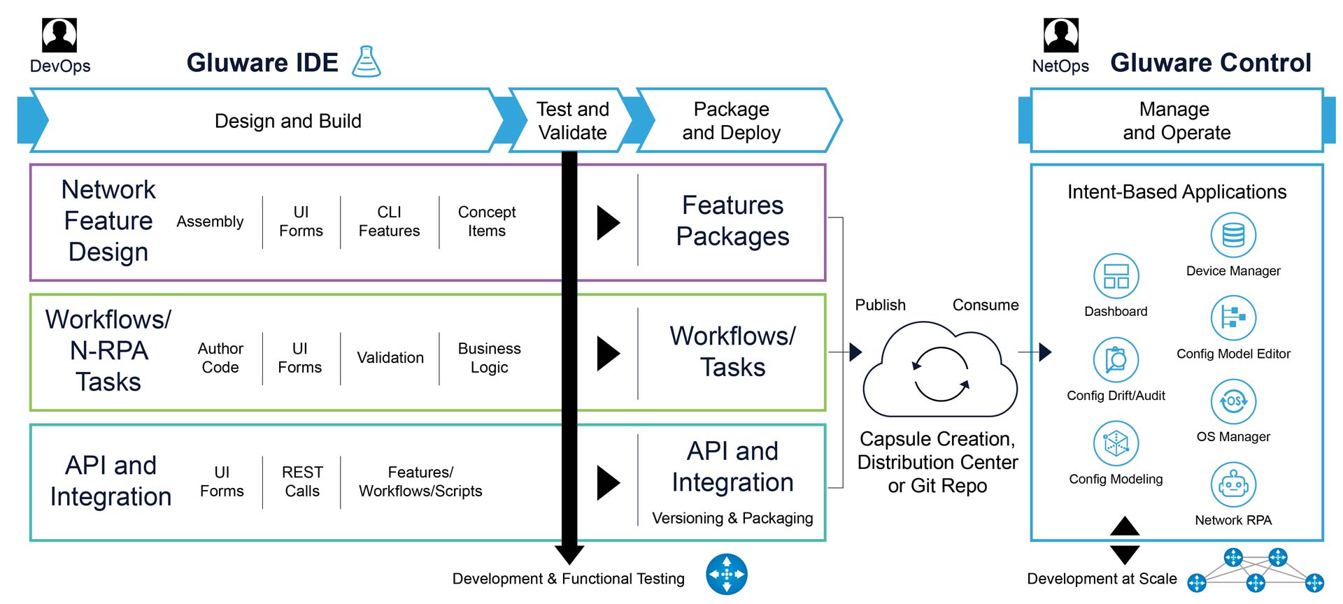 Automation packages developed in Gluware IDE can be directly published to Gluware Control for production use. Developers can also sync projects through Git-based repositories, allowing updates to be pushed directly from the IDE to Gluware Control — enabling faster iteration and deployment.